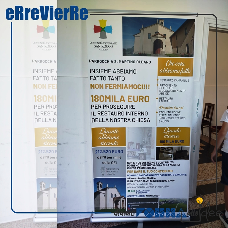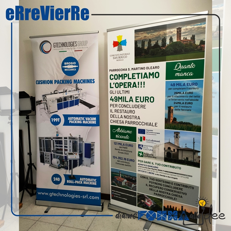 I Roll Up Errevierre sono completamente personalizzabili sia nel design grafico che nelle dimensioni. Studiamo insieme un progetto grafico in linea con la tua immagine coordinata, con colori, testi e immagini pensati per catturare l’attenzione e trasmettere il tuo messaggio con chiarezza e impatto visivo. Sono disponibili in versione monofacciale o bifacciale, con diverse opzioni di qualità per struttura e telo, dalla soluzione più economica a quella professionale.